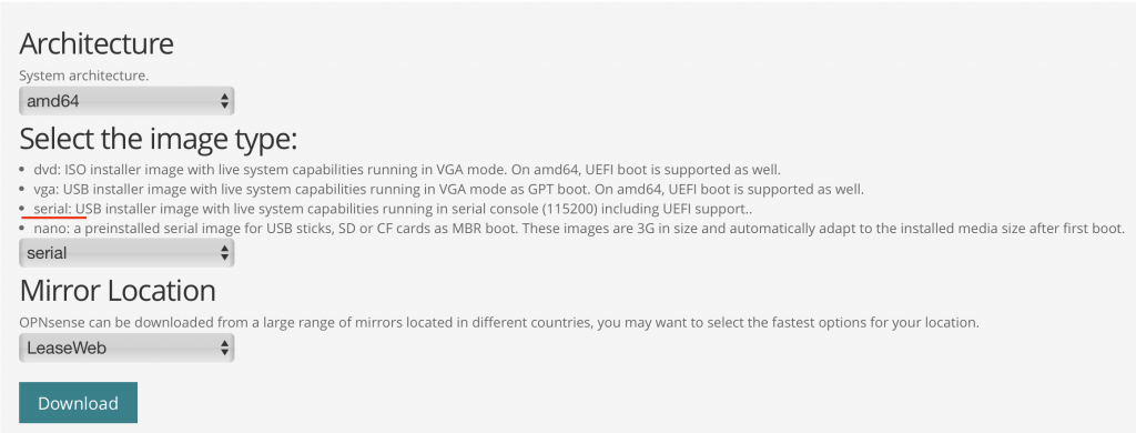- First, download the OPNsense image from the official website. As the Check Point 3200 appliance doesn’t have a display port, all installations are done through the serial port. The type of image you need to download in this case is serial.